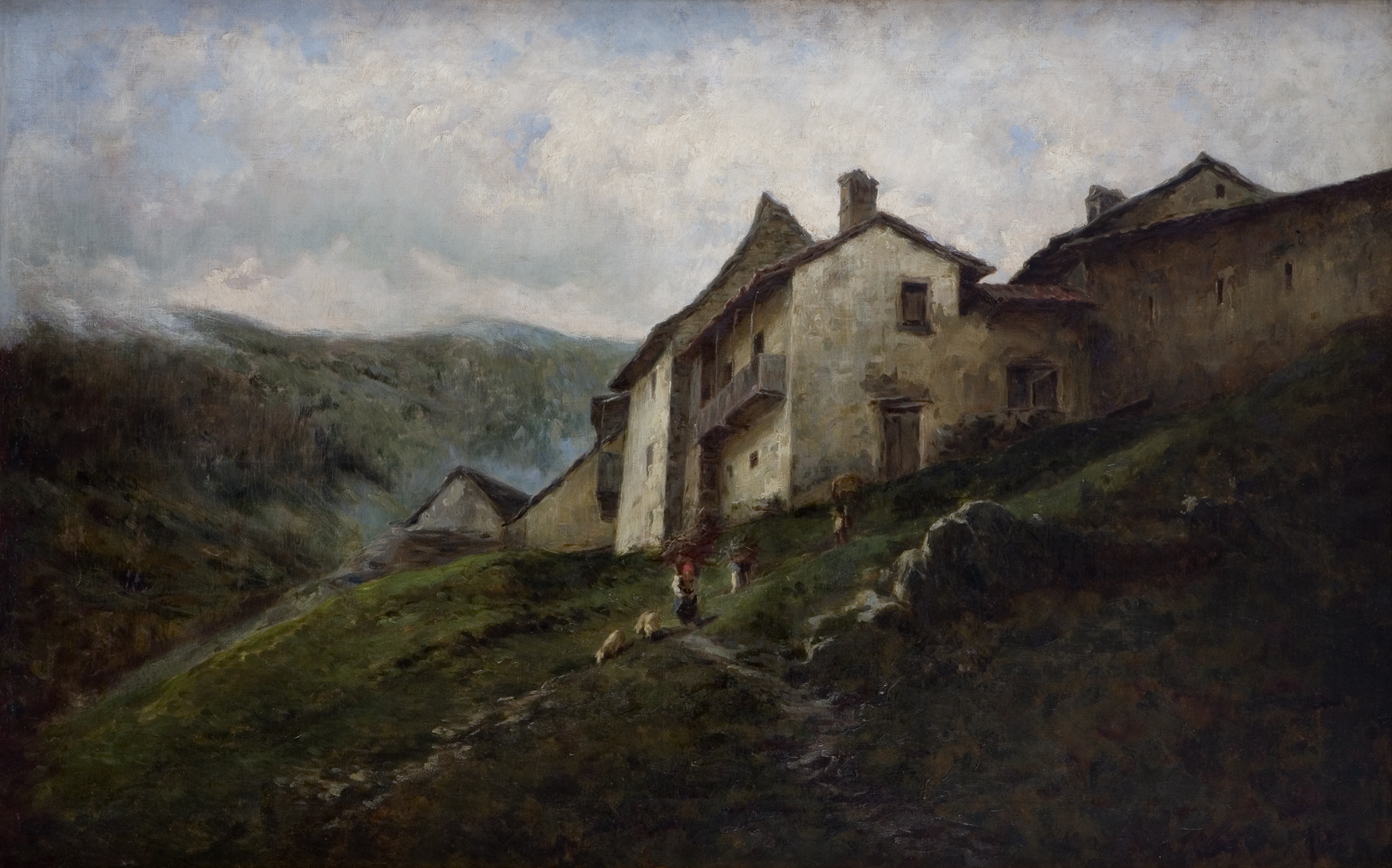 VILLAGGIO PREALPINO (Olio su tela, cm 90 x 140, ultimo decennio XIX sec.)